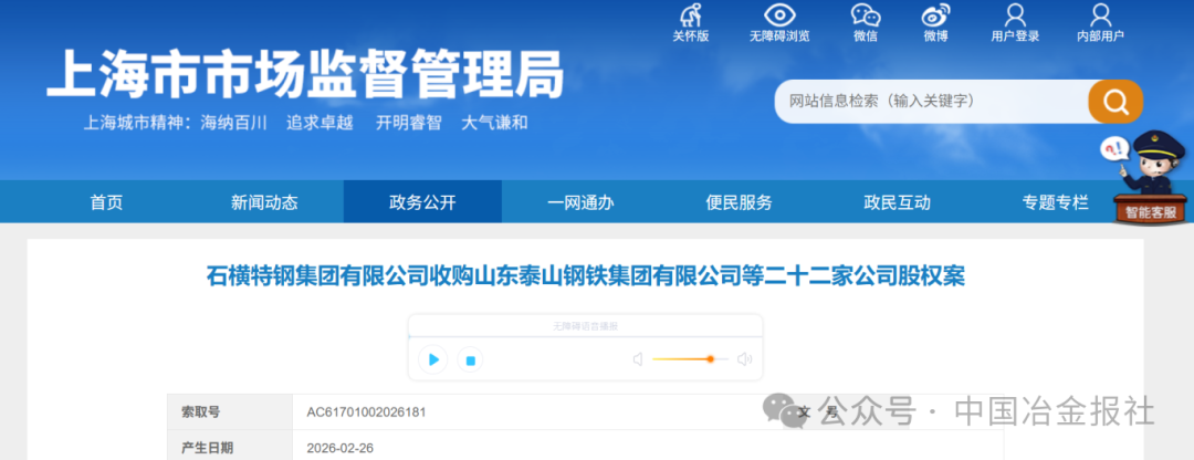 2月26日,上海市市場監(jiān)督管理局對《石橫特鋼集團有限公司收購山東泰山鋼鐵集團有限公司等二十二家公司股權案》進行了公示。