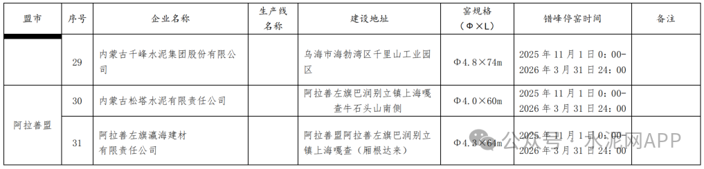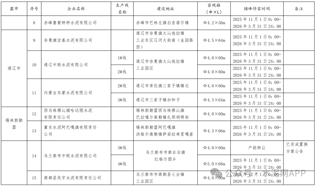 2025-2026年水泥熟料生產(chǎn)線(xiàn)錯(cuò)峰停窯及錯(cuò)峰置換清單如下: