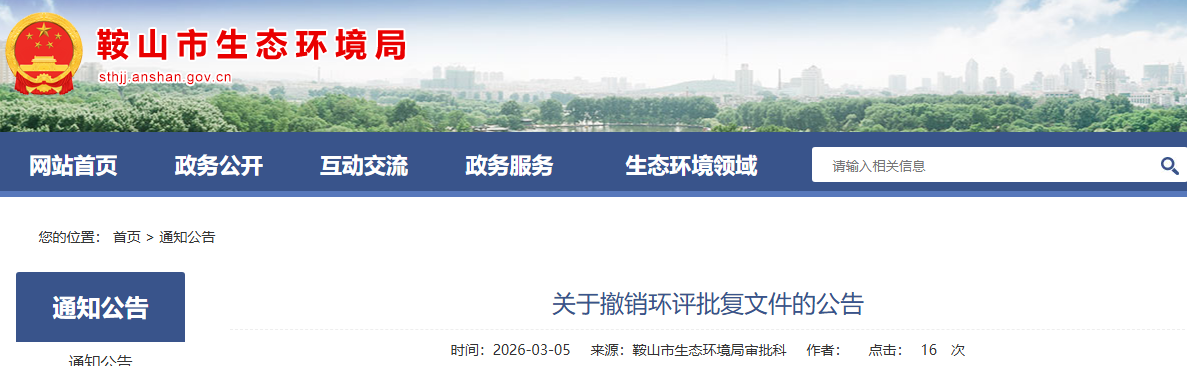 鞍山市行政審批局于2022年11月15日對(duì)《海城市牌樓鎮(zhèn)興源鎂制品廠改擴(kuò)建項(xiàng)目環(huán)境影響報(bào)告表》下達(dá)了環(huán)評(píng)批復(fù),批復(fù)文號(hào)為:鞍行審批復(fù)環(huán)〔2022〕76號(hào)?,F(xiàn)建設(shè)單位申請(qǐng)撤銷該環(huán)評(píng)批復(fù),依據(jù)《中華人民共和國(guó)行政許可法》第六十九條規(guī)定,經(jīng)研究,我局依法決定撤銷《海城市牌樓鎮(zhèn)興源鎂制品廠改擴(kuò)建項(xiàng)目環(huán)境影響報(bào)告表的批復(fù)》(鞍行審批復(fù)環(huán)〔2022〕76號(hào)),現(xiàn)予以公告。