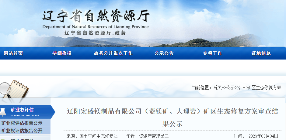 根據(jù)《土地復墾條例》和《遼寧省地質(zhì)環(huán)境保護條例》有關要求,我廳委托自然資源事務服務中心組織專家對《遼陽宏盛鎂制品有限公司(菱鎂礦、大理巖)礦區(qū)生態(tài)修復方案》進行了審查?,F(xiàn)將擬同意通過的該方案及專家評審意見進行公示,公示期自發(fā)布之日起5個工作日。