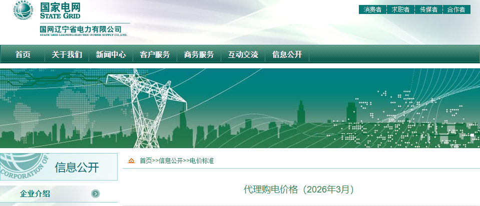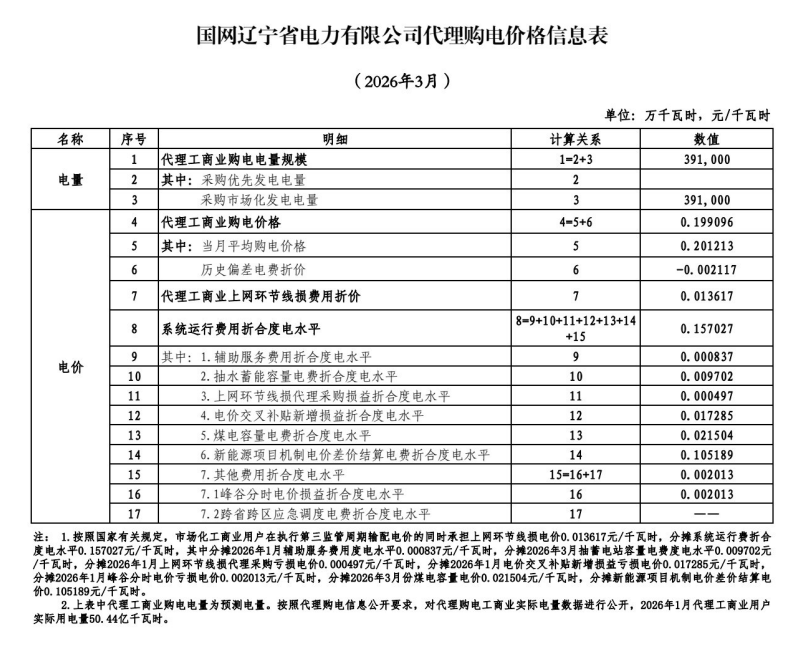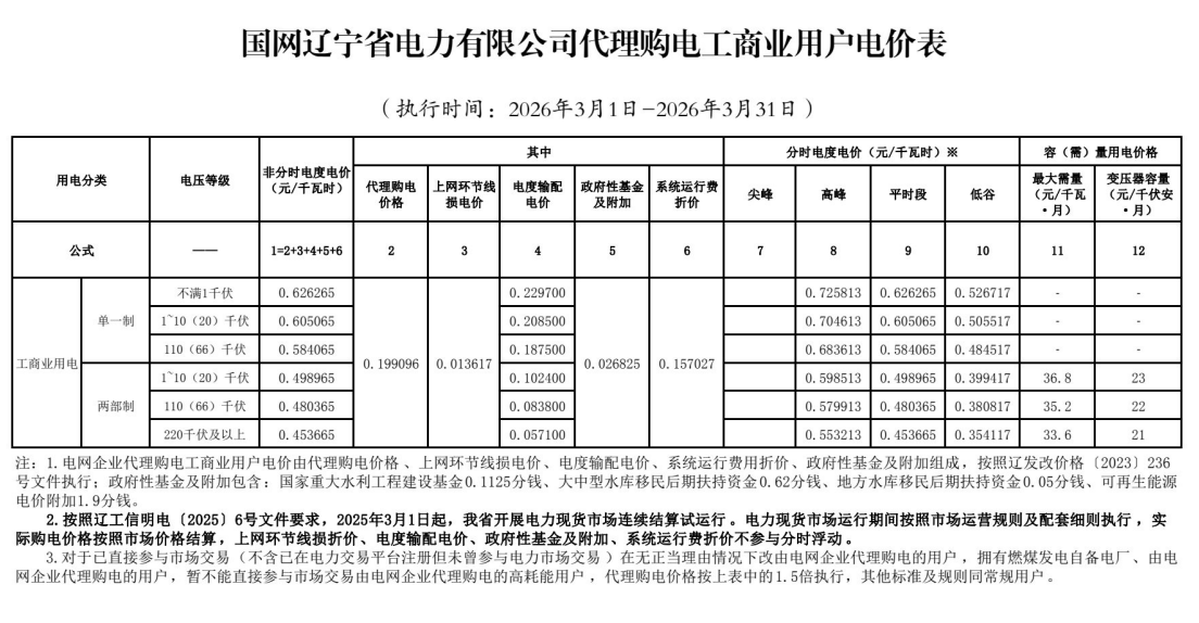 國網(wǎng)遼寧省電力有限公司代理購電工商業(yè)用戶電價表(2026年3月)