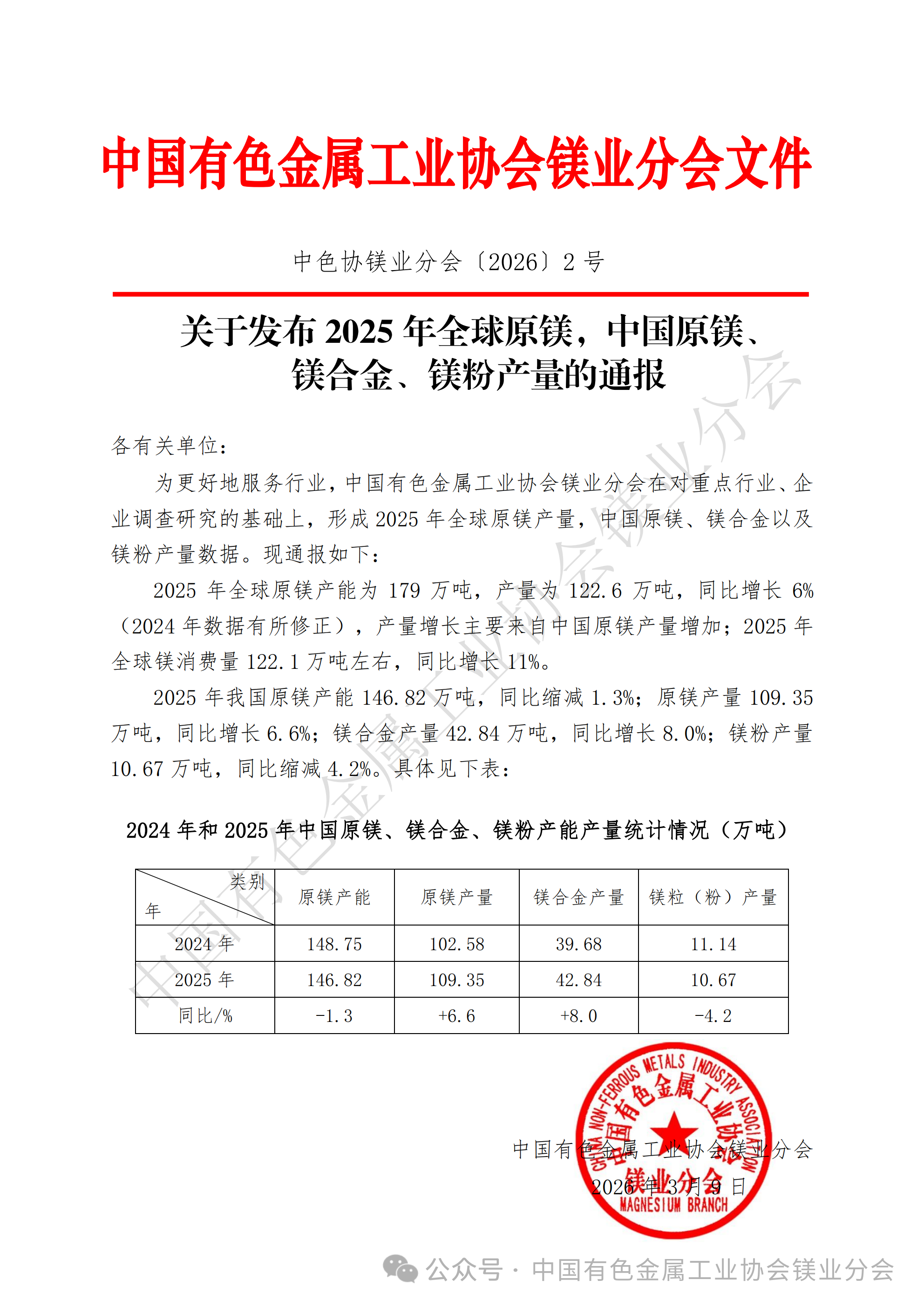 中國有色金屬工業(yè)協(xié)會鎂業(yè)分會關(guān)于發(fā)布2025年全球原鎂,中國原鎂、鎂合金、鎂粉產(chǎn)量的通報