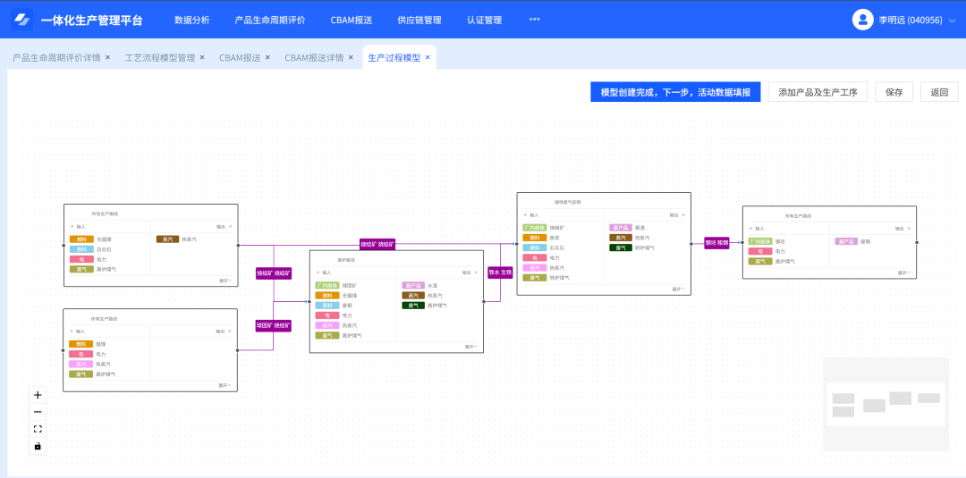 作為覆蓋產(chǎn)品全生命周期的智能碳管控工具,平臺構(gòu)建了產(chǎn)品生命周期評價(jià)、模型管理、CBAM專項(xiàng)管理等七大核心模塊,實(shí)現(xiàn)碳足跡全流程閉環(huán)管理,內(nèi)置最新版Ecoinvent數(shù)據(jù)庫,可完成專業(yè)核算環(huán)節(jié),既能生成符合中鋼協(xié)要求的EPD報(bào)告,也能對接歐盟CBAM申報(bào),為產(chǎn)品出口破除碳壁壘提供關(guān)鍵技術(shù)保障;應(yīng)用中,平臺可高效采集生產(chǎn)、物流、供應(yīng)鏈全維度數(shù)據(jù),支持自動獲取與手動填報(bào),其自主建模功能可精準(zhǔn)梳理碳排放分布,為減排和綠色產(chǎn)品開發(fā)提供決策依據(jù)。