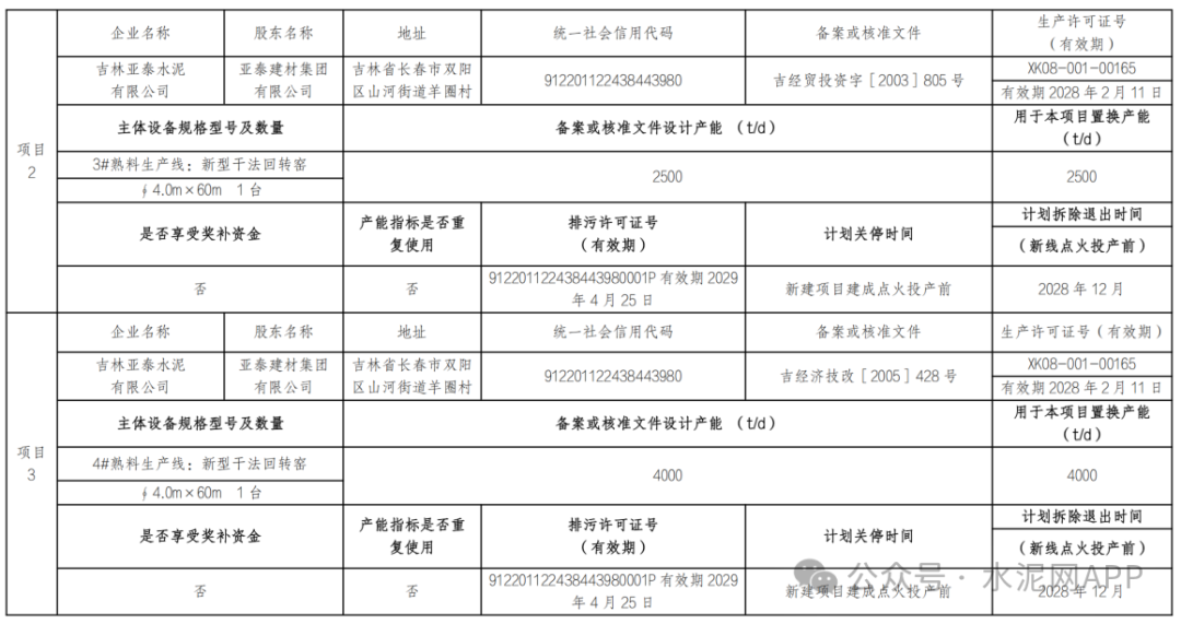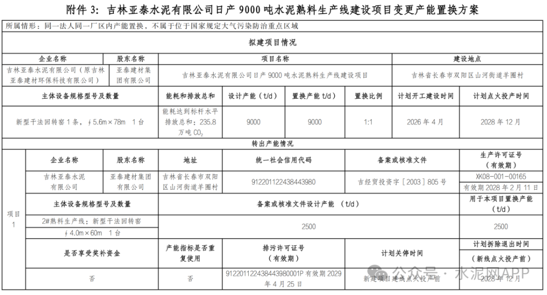 3月13日,吉林省工信廳發(fā)布吉林亞泰水泥有限公司日產(chǎn)9000噸水泥熟料生產(chǎn)線建設(shè)項目變更產(chǎn)能置換方案的公示。結(jié)合新舊置換方案顯示,原建設(shè)主體由吉林亞泰建材環(huán)保科技有限公司變更為吉林亞泰水泥有限公司;原計劃點火投產(chǎn)時間由2027年12月變更為2028年12月;置換產(chǎn)能退出時間由2027年12月變更為2028年12月。