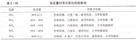 高品質(zhì)超微細滑石粉成片狀結(jié)構(gòu),用于塑料制品時,作為增強、改性功能填料不但能節(jié)省樹脂的使用量,還能顯著提高產(chǎn)品的剛度、沖擊強度、彎曲模量和熱穩(wěn)定性。滑石粉可均勻的成層疊狀分散在樹脂中,與樹脂有較好的相容性和力學(xué)性能的互補性。如同水泥制品中嵌入的金屬結(jié)構(gòu)網(wǎng),能夠在保持塑料的自身優(yōu)點時,形成力學(xué)性能優(yōu)異的增強支撐形態(tài),可提高塑料制品的物理性能,滑石粉的光散射作用還具有明顯的保溫、阻隔性能,在降低生產(chǎn)成本的同時,可明顯改善塑料制品的力學(xué)性能和物理性能。決定工業(yè)滑石粉質(zhì)量的主要指標(biāo)要看滑石粉的純度、白度和細度。評價一種滑石產(chǎn)品的優(yōu)劣,僅以一個指標(biāo)判斷質(zhì)量是片面的和不確切的?;募兌仍礁撸湓鰪姷男Ч胶?。滑石中的其他礦物雜質(zhì),金屬類礦物(特別是鐵)對塑料的耐老化性有十分明顯的影響?;壑械墓?SiO2)含量是衡量滑石粉品位的重要指標(biāo),滑石粉中硅含量越高,滑石的純度越高,應(yīng)用效果也好,價格也越高。我們要根據(jù)不同的塑料制品性能要求來選擇滑石粉,如在農(nóng)用薄膜中使用高硅滑石粉,不但薄膜的透光率好、薄膜的拉伸強度、斷裂強度、抗穿刺性等指標(biāo)都有提高。而在注塑、板材、棒材中使用的滑石粉硅含量要求不高,硅成分較低的產(chǎn)品不但價格較低,同時還可改善塑料制品的硬度、沖擊強變等?;壑械腟iO2含量對滑石粉的性能影響可參見表。