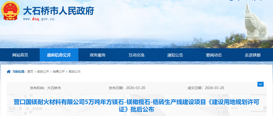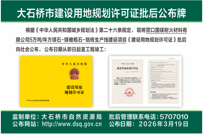 營口國鎂耐火材料有限公司5萬噸年方鎂石-鎂橄欖石-鋯磚生產(chǎn)線建設(shè)項(xiàng)目《建設(shè)用地規(guī)劃許可證》批后公布 ?