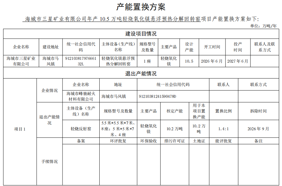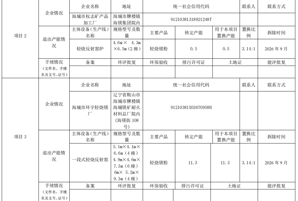 3.海城鎂礦集團(tuán)學(xué)耐鎂制品有限公司產(chǎn)能置換方案