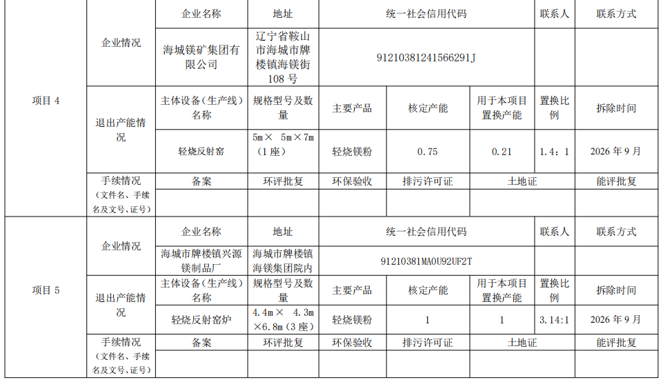 我廳2025年6月19日《關(guān)于海城鎂礦集團(tuán)有限公司等企業(yè)新建輕燒氧化鎂項(xiàng)目產(chǎn)能置換方案的通告》中海城市峰馳耐火材料有限公司產(chǎn)能置換方案,2026年3月4日《關(guān)于遼寧東和新材料股份有限公司等22戶企業(yè)新建輕燒氧化鎂項(xiàng)目產(chǎn)能置換方案的通告》中海城市中進(jìn)鎂砂廠產(chǎn)能置換方案、海城鎂礦集團(tuán)學(xué)耐鎂制品有限公司產(chǎn)能置換方案擬撤銷。