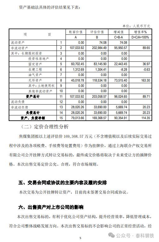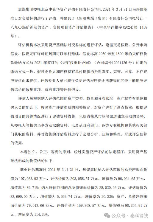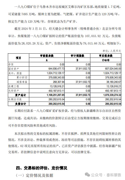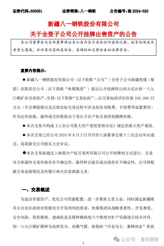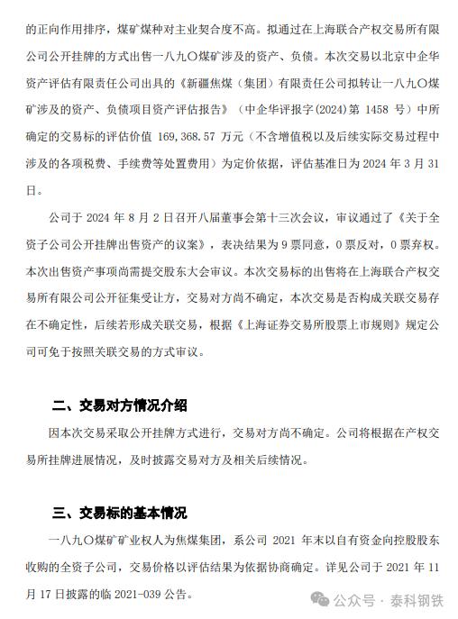 中國寶武旗下八一鋼鐵8月2日晚間發(fā)布公告稱,為盤活存量資產(chǎn)、優(yōu)化公司資源配置,進一步聚焦主責主業(yè),同時滿足新疆維吾爾自治區(qū)政府對資源充分開發(fā)利用的要求,焦煤集團從戰(zhàn)略重要性、開發(fā)難度、安全風險、投資額度、建成收益及煤種稀缺度六個維度對礦產(chǎn)資源進行綜合評價。因一八九〇煤礦煤種為高揮發(fā)分,高磷氣煤,按煉制“冷態(tài)為主、兼顧熱態(tài)”焦炭的正向作用排序,煤礦煤種對主業(yè)契合度不高。擬通過在上海聯(lián)合產(chǎn)權(quán)交易所有限公司公開掛牌的方式出售一八九〇煤礦涉及的資產(chǎn)、負債。本次交易以北京中企華資產(chǎn)評估有限責任公司出具的《新疆焦煤(集團)有限責任公司擬轉(zhuǎn)讓一八九〇煤礦涉及的資產(chǎn)、負債項目資產(chǎn)評估報告》中所確定的交易標的評估價值約16.94億元為定價依據(jù),評估基準日為2024年3月31日。