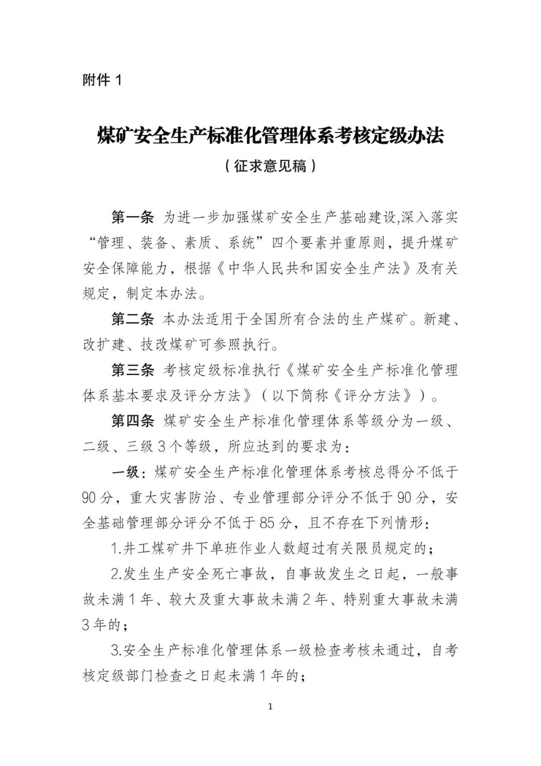 1.煤礦安全生產(chǎn)標(biāo)準(zhǔn)化管理體系考核定級(jí)辦法(征求意見稿)