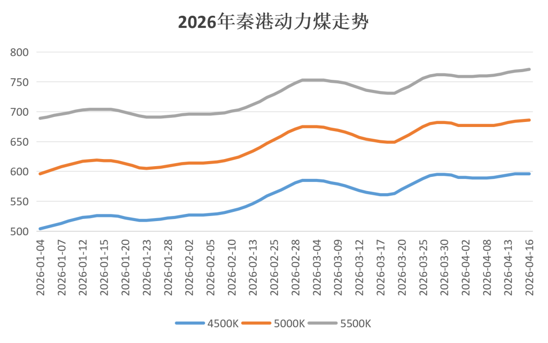 近期,港口動(dòng)力煤市場(chǎng)迎來(lái)一波持續(xù)約半個(gè)月的小幅反彈行情。截至4月17日,秦皇島港各熱值煤價(jià)均有不同程度上漲:5500K、5000K、4500K動(dòng)力煤報(bào)價(jià)分別報(bào)771元/噸、686元/噸、596元/噸,較月初分別上調(diào)12元/噸、9元/噸、6元/噸。