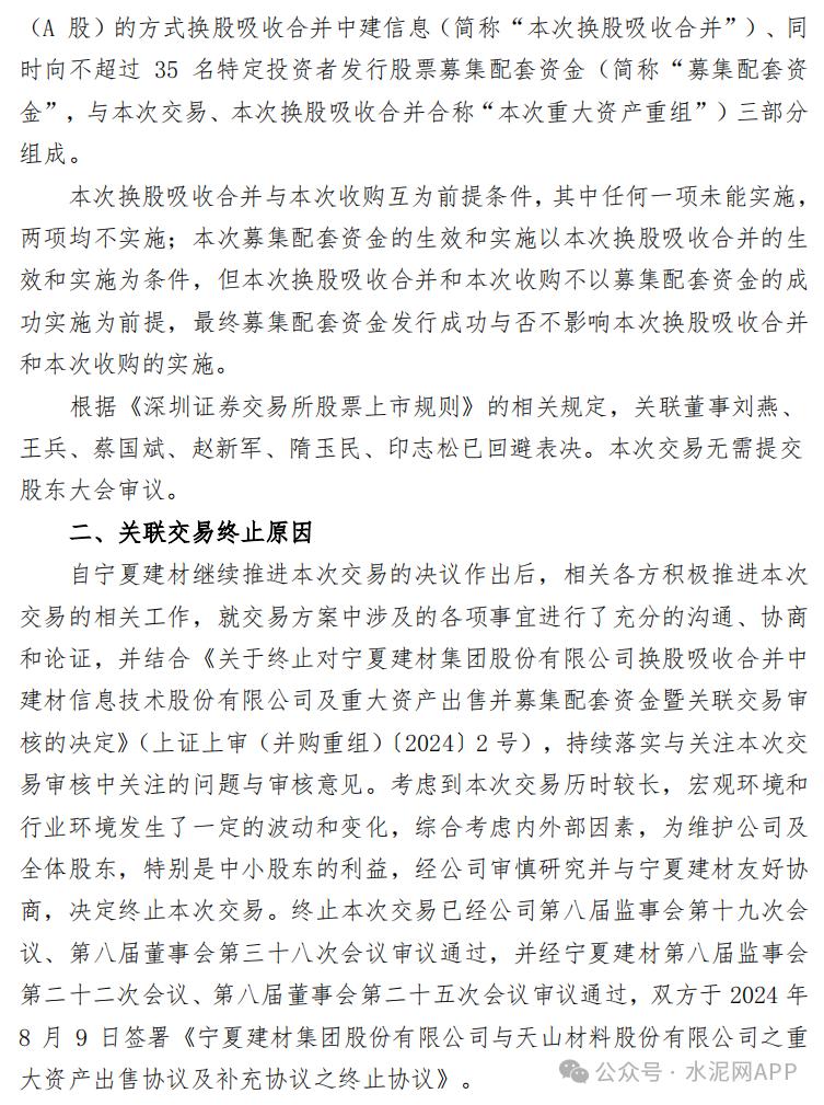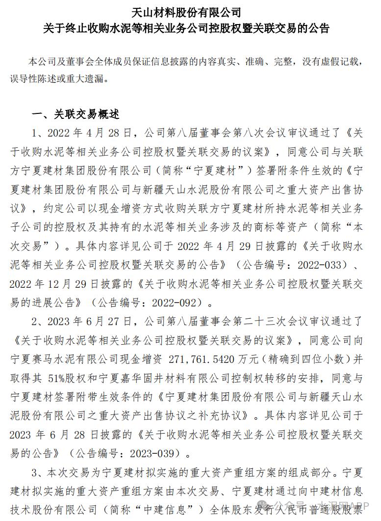 天山股份8月9日晚間公告,因交易歷時(shí)較長,宏觀環(huán)境和行業(yè)環(huán)境發(fā)生了一定的波動(dòng)和變化,公司決定終止此前計(jì)劃收購關(guān)聯(lián)方寧夏建材所持水泥等相關(guān)業(yè)務(wù)子公司的控股權(quán)及其持有的水泥等相關(guān)業(yè)務(wù)涉及的商標(biāo)等資產(chǎn)的交易。天山股份同時(shí)公告,公司實(shí)控人中國建材集團(tuán)、控股股東中國建材股份正在積極研究論證關(guān)于基礎(chǔ)建材板塊相關(guān)企業(yè)的其他整合方案,并計(jì)劃在條件成熟后推進(jìn)。