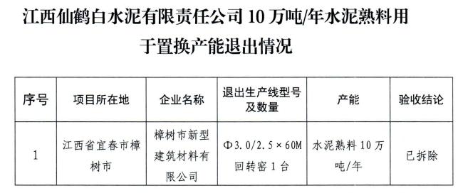 與此同時(shí)。江西工信廳另一則公示顯示,現(xiàn)用于江西仙鶴白水泥有限責(zé)任公司10萬噸/年水泥熟料產(chǎn)能置換的樟樹市新型建筑材料有限公司10萬噸/年水泥熟料生產(chǎn)線已按要求進(jìn)行了拆除,不具備水泥熟料生產(chǎn)條件,并通過現(xiàn)場(chǎng)核查驗(yàn)收。