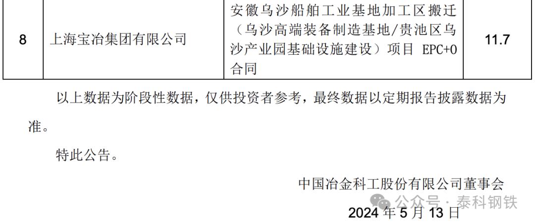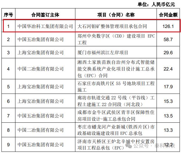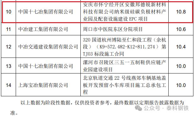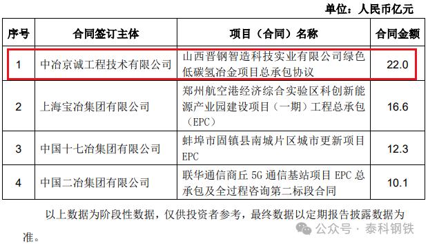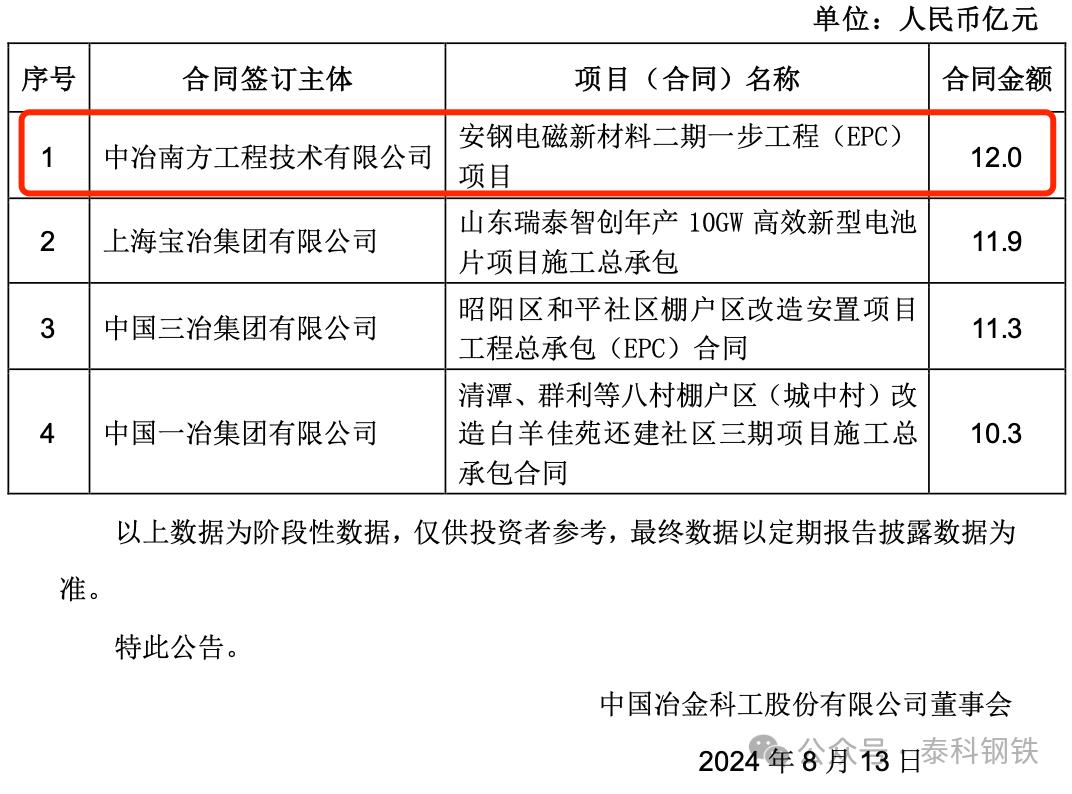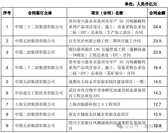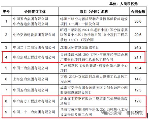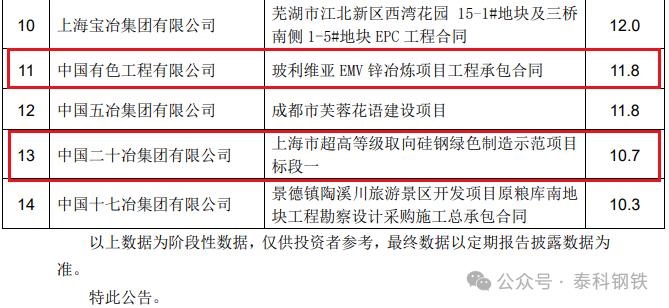 1、中冶南方工程技術(shù)有限公司簽唐山文豐特鋼有限公司燒結(jié)煙氣處理提效改造項(xiàng)目,合同額12億元;2、中冶焦耐工程技術(shù)有限公司簽貴州能源水城200萬噸/年循環(huán)經(jīng)濟(jì)綜合利用煤焦化項(xiàng)目EPC總承包工程合同,合同額21.1億元;3、中國二十二冶集團(tuán)有限公司簽烏海市黃河集團(tuán)駿平焦化200萬噸焦化工程設(shè)備采購及施工合同,合同額12億元;4、中國有色工程有限公司簽玻利維亞EMV鋅冶煉項(xiàng)目工程承包合同 ,合同額11.8億元;5、中國二十冶集團(tuán)有限公司簽上海市超高等級取向硅鋼綠色制造示范項(xiàng)目標(biāo)段一,合同額10.7億元;6、中冶國際工程集團(tuán)有限公司和中冶賽迪集團(tuán)有限公司簽俄羅斯蘇洛亞姆釩鈦磁鐵礦及冶金綜合體項(xiàng)目,合同額108億元;7、中國五冶集團(tuán)有限公司簽邢臺鋼鐵有限責(zé)任公司轉(zhuǎn)型升級搬遷 改造項(xiàng)目熔融還原煉鐵、煉鋼、軋鋼 主體及配套建設(shè)(一期)工程土建及安裝總承包施工工程合同,合同額25.0億元;8、中冶南方工程技術(shù)有限公司簽福建青拓不銹鋼中厚板項(xiàng)目,合同額13.3億元;9、中冶南方工程技術(shù)有限公司簽嘉峪關(guān)市酒鋼碳薄廠CSP改造主體工程合同,合同額13.1億元。10、中冶京誠工程技術(shù)有限公司簽山西晉鋼智造科技實(shí)業(yè)有限公司綠色低碳?xì)湟苯痦?xiàng)目總承包協(xié)議合同,合同額22.0億元。11、中國華冶科工集團(tuán)有限公司簽大石河鉬礦整體管理項(xiàng)目承包合同,合同額126.1億元。12、中冶南方工程技術(shù)有限公司安鋼電磁新材料二期一步工程(EPC) 項(xiàng)目,合同額12.0億元。中國中冶7月新簽單筆合同額在人民幣10億元以上的重大工程承包合同項(xiàng)目: