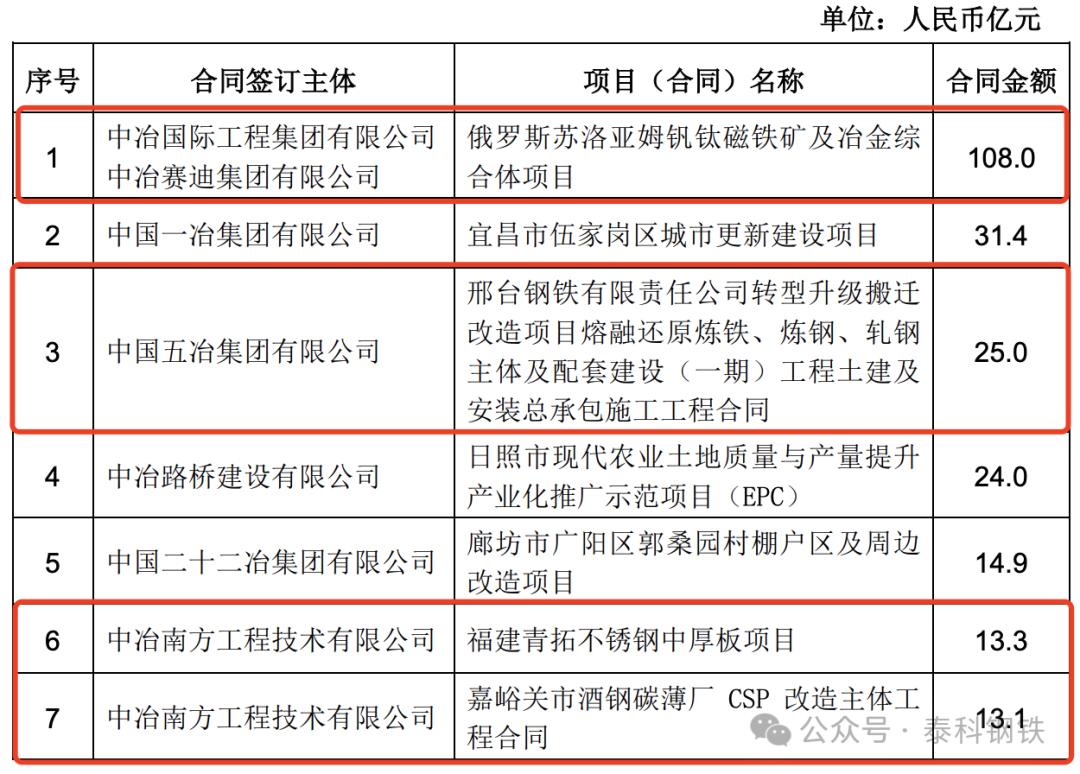 2024年8月,中國中冶發(fā)布2024年1-7月經(jīng)營情況公告:中國中冶2024年1-7月新簽合同額人民幣7,504.4 億元,較上年同期降低 6.4%,其中新簽海外合同額人民幣443.9 億元,較上年同期增長 83.0%。其中中冶南方工程技術(shù)有限公司7月新簽安鋼電磁新材料二期一步工程(EPC) 項(xiàng)目,合同額12.0億元。1-7月單體最大的為中國華冶科工集團(tuán)有限公司6月新簽大石河鉬礦整體管理項(xiàng)目承包合同,合同額高達(dá)126.1億元!中冶國際工程集團(tuán)有限公司和中冶賽迪集團(tuán)有限公司簽下俄羅斯蘇洛亞姆釩鈦磁鐵礦及冶金綜合體項(xiàng)目,合同額108億元。
