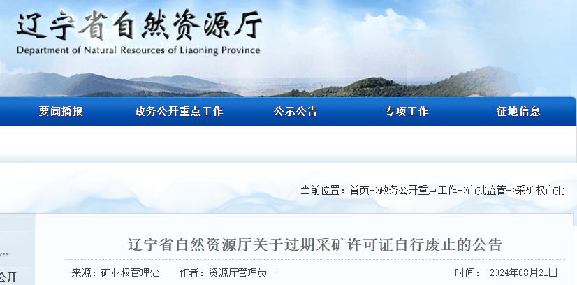 根據(jù)《礦產(chǎn)資源開采登記管理辦法》(國務院令第241號)和《自然資源部關于進一步完善礦產(chǎn)資源勘查開采登記管理的通知》(自然資規(guī)〔2023〕4號)等有關規(guī)定,經(jīng)核實,海城市旭益升菱鎂石采掘有限公司采礦許可證在有效期屆滿前未依法申請辦理延續(xù)登記手續(xù),采礦許可證自有效期屆滿之日起已經(jīng)自行廢止,現(xiàn)予以公告。