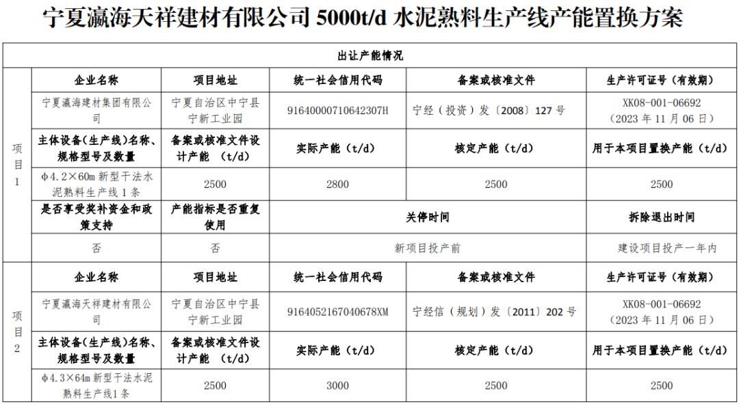 其中,包括中衛(wèi)市寧夏瀛海天祥建材有限公司2條2500t/d熟料生產(chǎn)線,退出產(chǎn)能合計150萬噸。