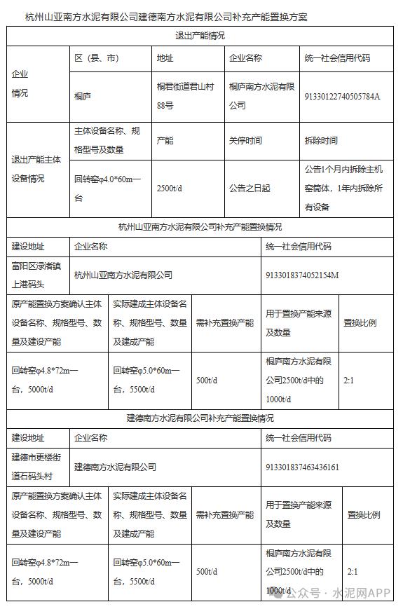 根據(jù)公告,杭州山亞南方水泥有限公司和建德南方水泥有限公司需分別補充產能1000t/d,置換比例均為2:1。退出產能為桐廬南方水泥有限公司2500t/d。