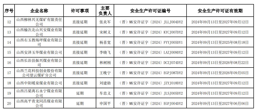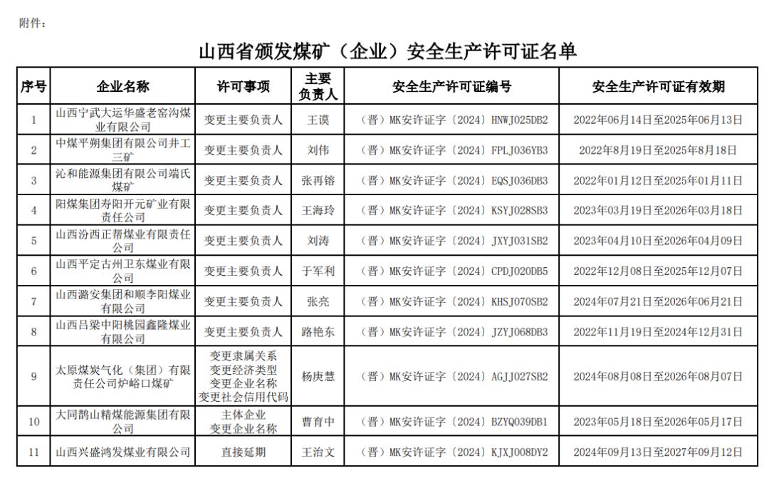 山西省應(yīng)急管理廳關(guān)于頒發(fā)煤礦(企業(yè))安全生產(chǎn)許可證的公告