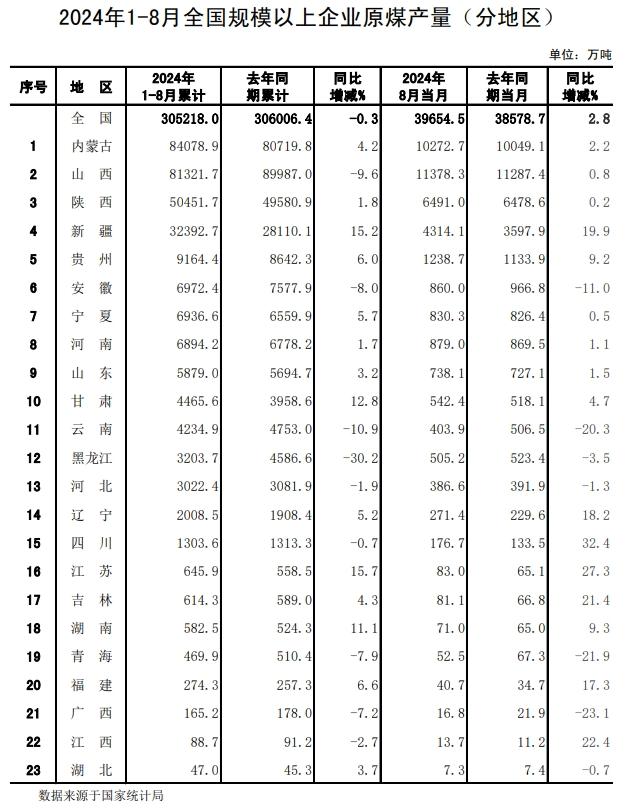 2024年1-8月份全國(guó)規(guī)模以上分省區(qū)原煤產(chǎn)量數(shù)據(jù)發(fā)布