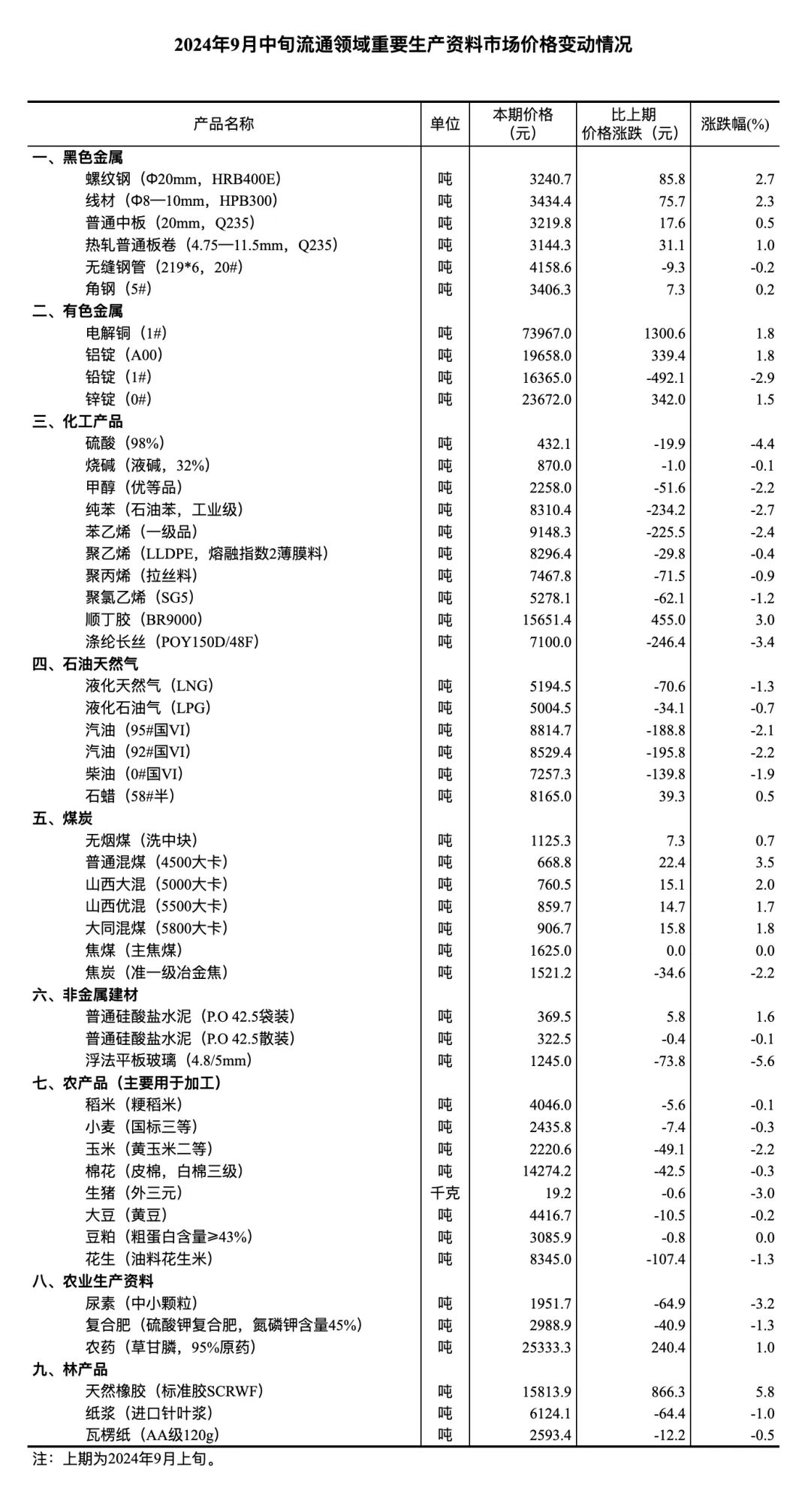 據(jù)對全國流通領域9大類50種重要生產(chǎn)資料市場價格的監(jiān)測顯示,2024年9月中旬與9月上旬相比,18種產(chǎn)品價格上漲,30種下降,2種持平。