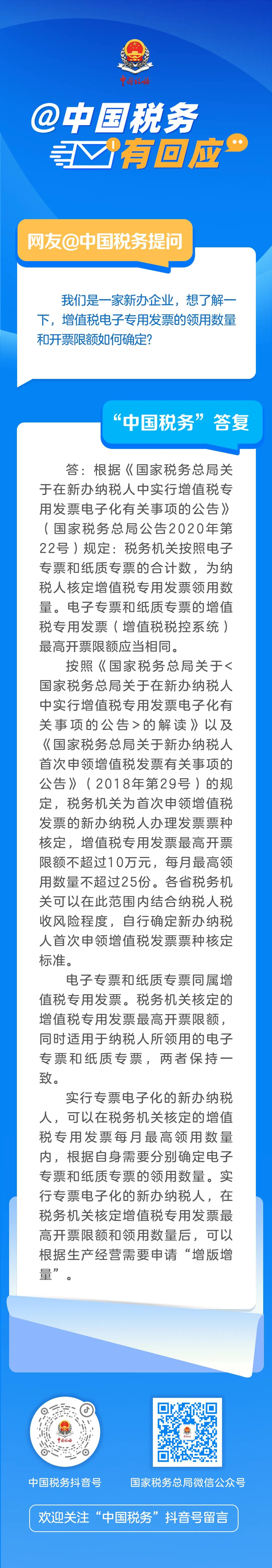 有網(wǎng)友提問:“我們是一家新辦企業(yè),想了解一下,增值稅電子專用發(fā)票的領(lǐng)用數(shù)量和開票限額是如何確定的?”一起來看看回復(fù)吧↓