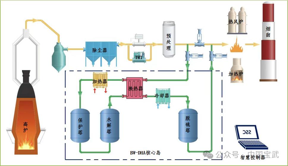 BW-DHA是寶武水務自主研發(fā)、具有獨立知識產權的高爐煤氣精脫硫源頭治理技術,具備“高、低、長”三大特征,“高”指高效率、“低”指低能耗、“長”指長壽命。同時,針對行業(yè)痛點,寶武水務研發(fā)出的“煤氣調質”“高活性抗毒水解劑”“熱量循環(huán)回收”“動態(tài)控溫”“智慧運行”等五大核心技術大大提升了煤氣的質量,使其能夠更好地應用于發(fā)電、加熱等環(huán)節(jié),提高能源利用效率,同時也減少了對周邊環(huán)境的影響。其中,煤氣調質技術采用多級預處理,能有效去除高爐煤氣中的有害物質,延長水解劑的使用壽命,穩(wěn)定TRT(高爐煤氣余壓透平發(fā)電裝置)出口煤氣溫度。