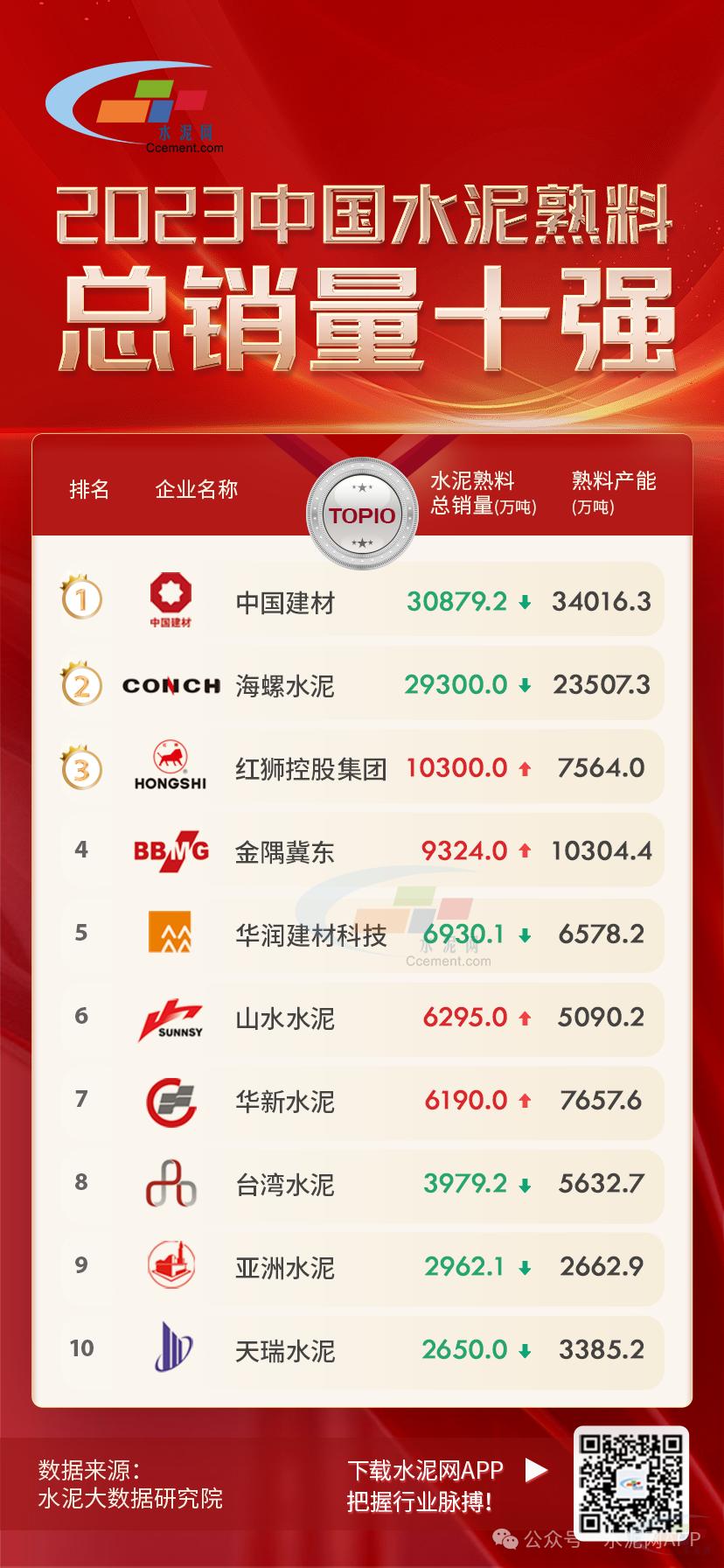 日前,中國(guó)水泥網(wǎng)發(fā)布2023年中國(guó)水泥熟料總銷量TOP10排行榜。