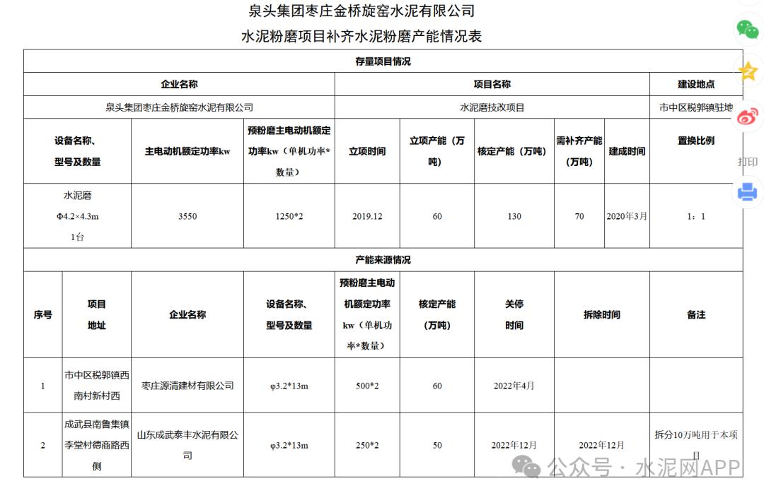 公告顯示,泉頭集團棗莊金橋旋窯水泥有限公司水泥磨技改項目建成于2020年3月,立項產能為60萬噸,核定產能為130萬噸,需補齊產能70萬噸。
