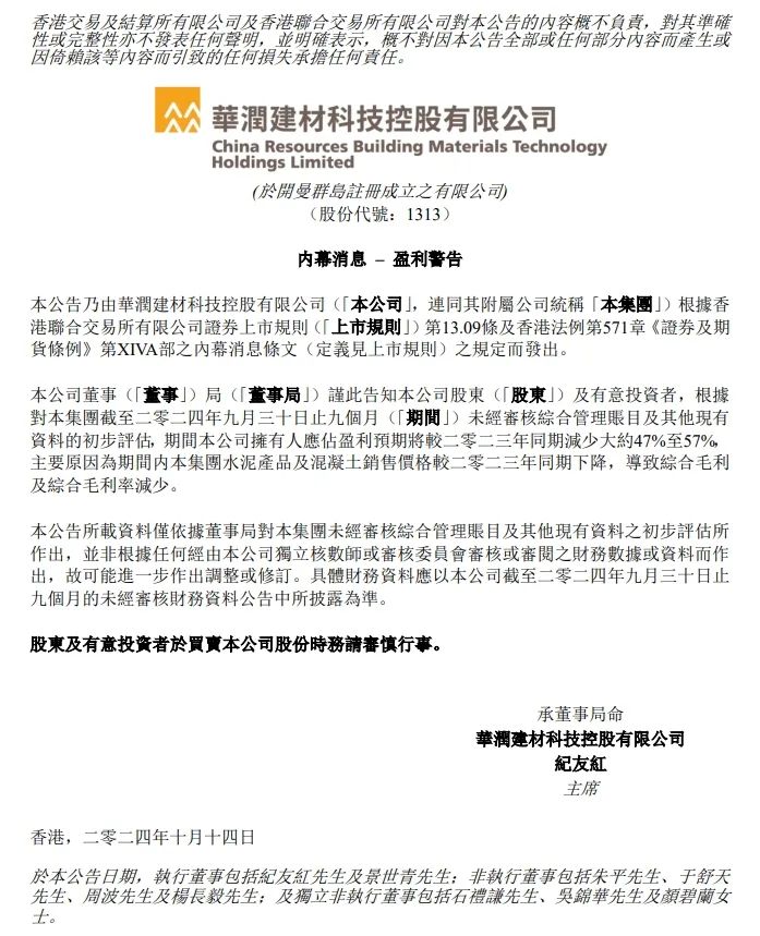 華潤建材科技(01313)公布,該集團(tuán)預(yù)期2024年前9個(gè)月公司擁有人應(yīng)占盈利(歸母凈利潤)同比減少大約47%至57%,主要原因?yàn)槠陂g內(nèi)集團(tuán)水泥產(chǎn)品及混凝土銷售價(jià)格較2023年同期下降,導(dǎo)致綜合毛利及綜合毛利率減少。據(jù)了解,2023年同期,華潤建材科技營業(yè)額約178.93億港元,擁有人應(yīng)占盈利7.1億港元。