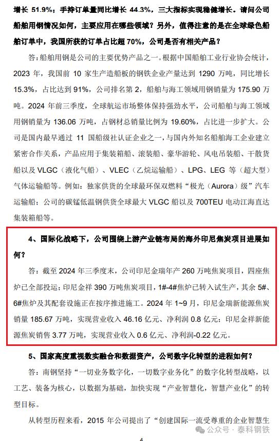 南鋼股份10月29日發(fā)布關(guān)于2024年第三季度業(yè)績(jī)說(shuō)明會(huì)召開(kāi)情況的公告,其中海外印尼焦炭項(xiàng)目進(jìn)展:關(guān)于截至2024年三季度末,公司印尼金瑞年產(chǎn)260萬(wàn)噸焦炭項(xiàng)目,四座焦?fàn)t已全部投運(yùn);印尼金祥390萬(wàn)噸焦炭項(xiàng)目,1#-4#焦?fàn)t已轉(zhuǎn)入試生產(chǎn),其余5#、6#焦?fàn)t及其配套設(shè)施正在按序推進(jìn)施工。2024年1~9月,印尼金瑞新能源焦炭銷量185.67萬(wàn)噸,實(shí)現(xiàn)營(yíng)業(yè)收入46.16億元、凈利潤(rùn)0.8億元;印尼金祥新能源焦炭銷售3.77萬(wàn)噸,實(shí)現(xiàn)營(yíng)業(yè)收入0.6億元、凈利潤(rùn)-0.22億元。具體如下: