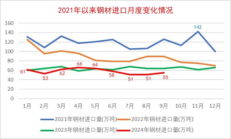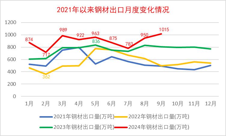 2024年9月,我國出口鋼材1015.4萬噸,環(huán)比增加65.8萬噸、增幅6.9%,同比增加209.0萬噸、增幅25.9%;平均出口單價719.6美元/噸,環(huán)比減少35.9美元/噸、降幅4.8%,同比減少94.6美元/噸、降幅11.6%。1-9月,我國累計出口鋼材8071.2萬噸,同比增加1389.4萬噸、增幅20.8%;累計平均出口單價769.9美元/噸,同比減少215.8美元/噸、降幅21.9%;累計出口鋼坯341.2萬噸,同比增加93.9萬噸、增幅38.0%;折合粗鋼凈出口8015萬噸,同比增加1645萬噸、增幅25.8%。2024年9月,我國進(jìn)口鋼材55.4萬噸,環(huán)比增加4.5萬噸、增幅8.8%,同比減少8.7萬噸、降幅13.6%;平均進(jìn)口單價1675.5美元/噸,環(huán)比減少65.5美元/噸、降幅3.8%,同比增加43.5美元/噸、增幅2.7%。1-9月,我國累計進(jìn)口鋼材518.5萬噸,同比減少51.3萬噸、降幅9.0%;累計平均進(jìn)口單價1673.4美元/噸,同比減少15.2美元/噸、降幅0.9%;累計進(jìn)口鋼坯160.3萬噸,同比減少37.6萬噸、降幅19.0%。