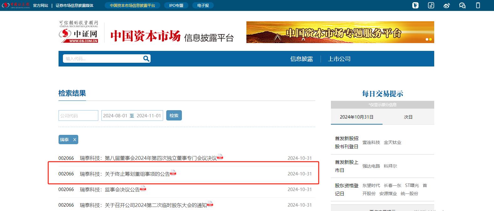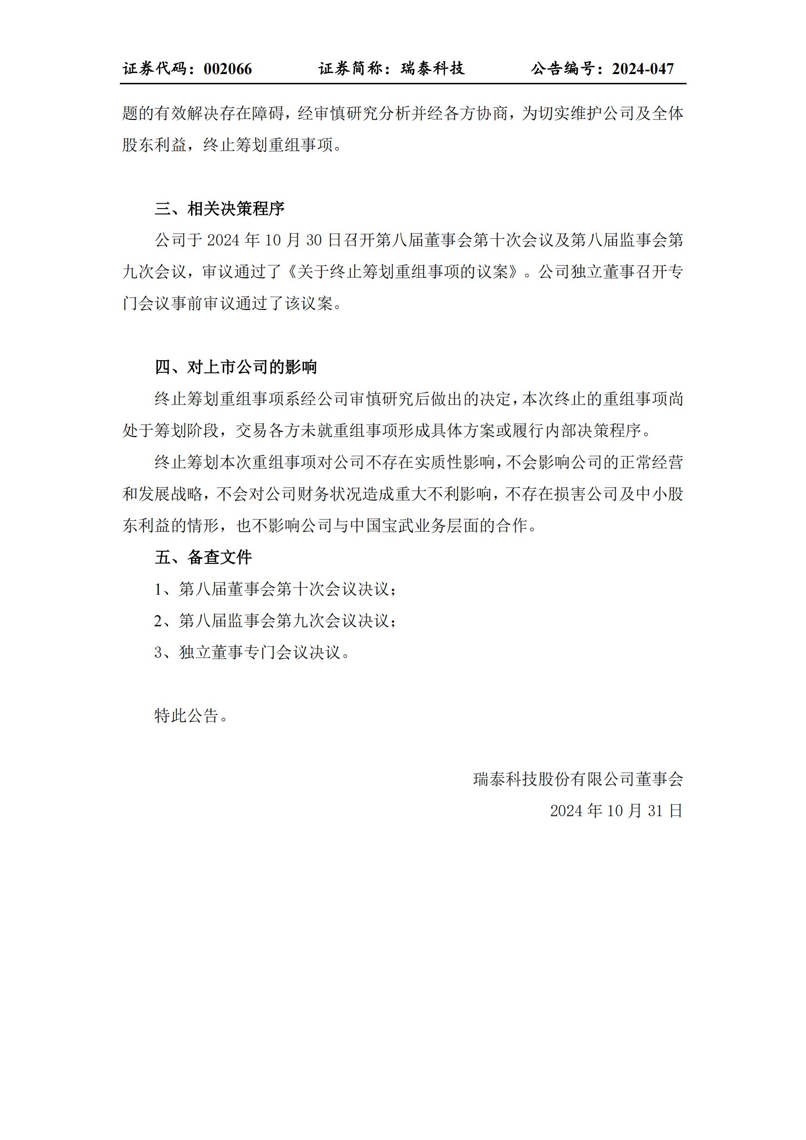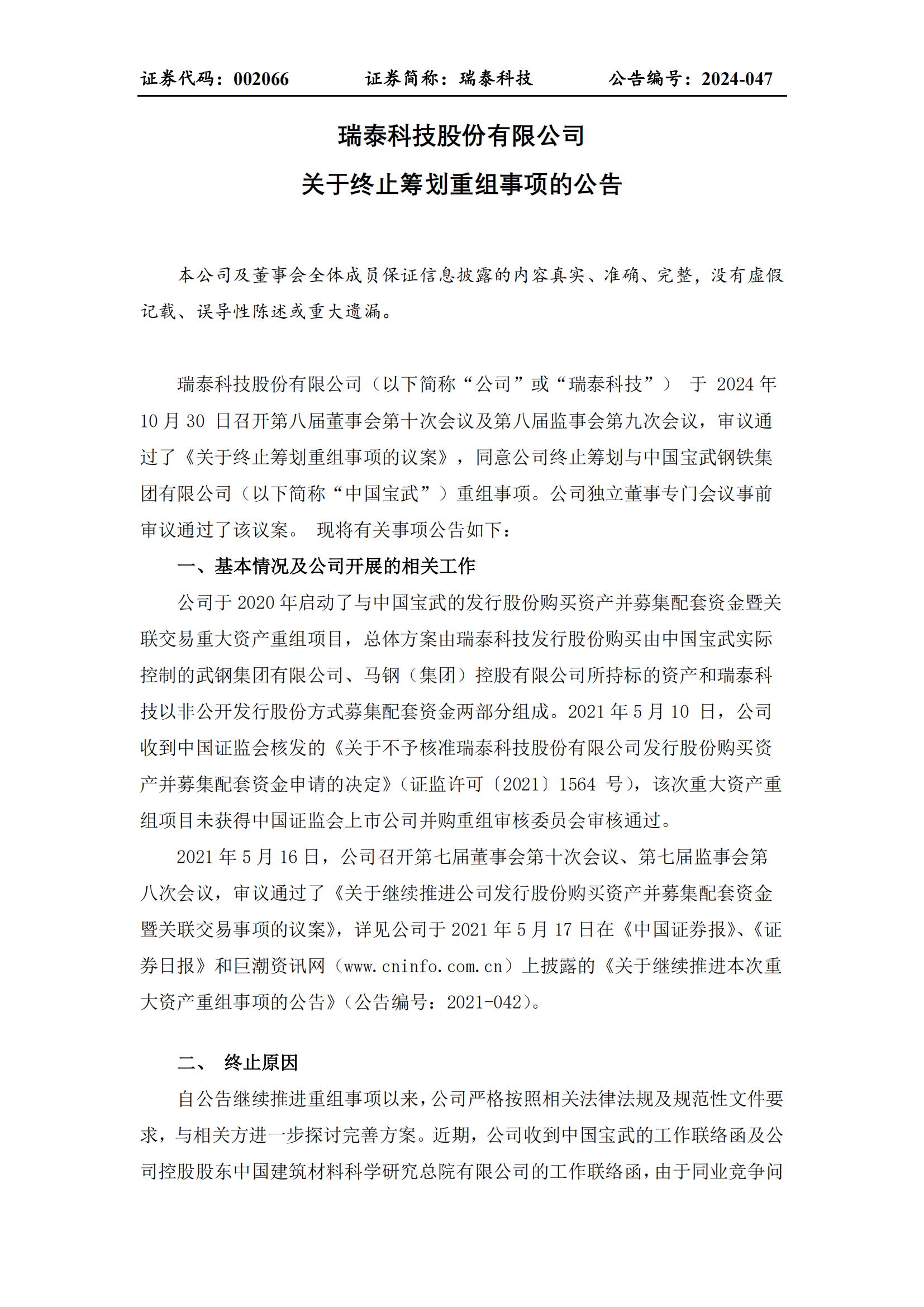 瑞泰科技10月30日晚公告,公司董事會(huì)審議通過了《關(guān)于終止籌劃重組事項(xiàng)的議案》,同意公司終止籌劃與中國(guó)寶武的重組事項(xiàng)。本公告同日刊登在《中國(guó)證券報(bào)》、《證券日?qǐng)?bào)》和巨潮資訊網(wǎng)(www.cninfo.com.cn)上的《瑞泰科技股份有限公司關(guān)于終止籌劃重組事項(xiàng)的公告》(公告編號(hào):2024-047)。