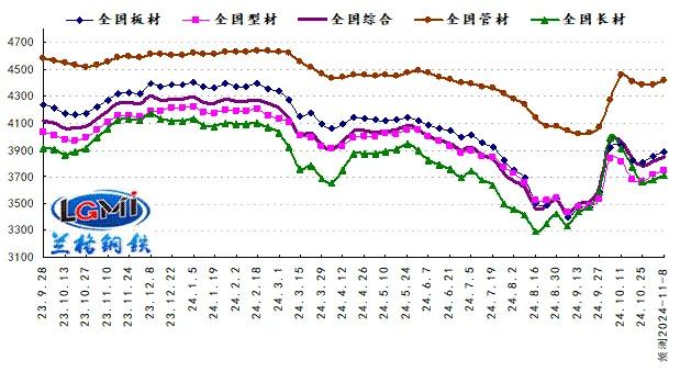 2024年第44周(2024.10.28-11.1)蘭格鋼鐵全國絕對(duì)價(jià)格指數(shù)為3813元,較上周上升0.7%,較去年同期下降7.4%;其中,蘭格鋼鐵長材絕對(duì)價(jià)格指數(shù)為3674元,較上周上升0.2%,較去年同期下降7.3%;蘭格鋼鐵型材絕對(duì)價(jià)格指數(shù)為3718元,較上周上升1.6%,較去年同期下降7.9%;蘭格鋼鐵板材絕對(duì)價(jià)格指數(shù)為3858元,較上周上升1.2%,較去年同期下降8.2%;蘭格鋼鐵管材絕對(duì)價(jià)格指數(shù)為4389元,較上周上升0.1%,較去年同期下降3.0%。