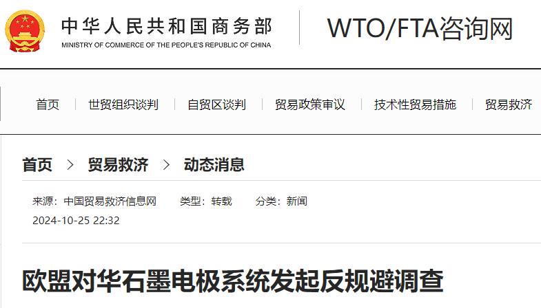 2024年10月18日,歐盟委員會(huì)發(fā)布公告稱(chēng),應(yīng)歐洲碳和石墨協(xié)會(huì)(The European Carbon and Graphite Association)于2024年9月4日提出的申請(qǐng),對(duì)原產(chǎn)于中國(guó)的石墨電極系統(tǒng)(Graphite Electrode Systems)進(jìn)行反規(guī)避調(diào)查,審查表觀(guān)密度大于等于1.5g/cm3、電阻率等于或小于7.0 μ.Ω.m、公稱(chēng)直徑超過(guò)350毫米的塊狀或圓柱形人造石墨(涉案產(chǎn)品的歐盟CN(Combined Nomenclature)編碼為ex 3801 10 00和ex 3801 90 00;TARIC代碼3801 10 00 15和3801 90 00 80是否存在規(guī)避現(xiàn)行反傾銷(xiāo)措施的行為。