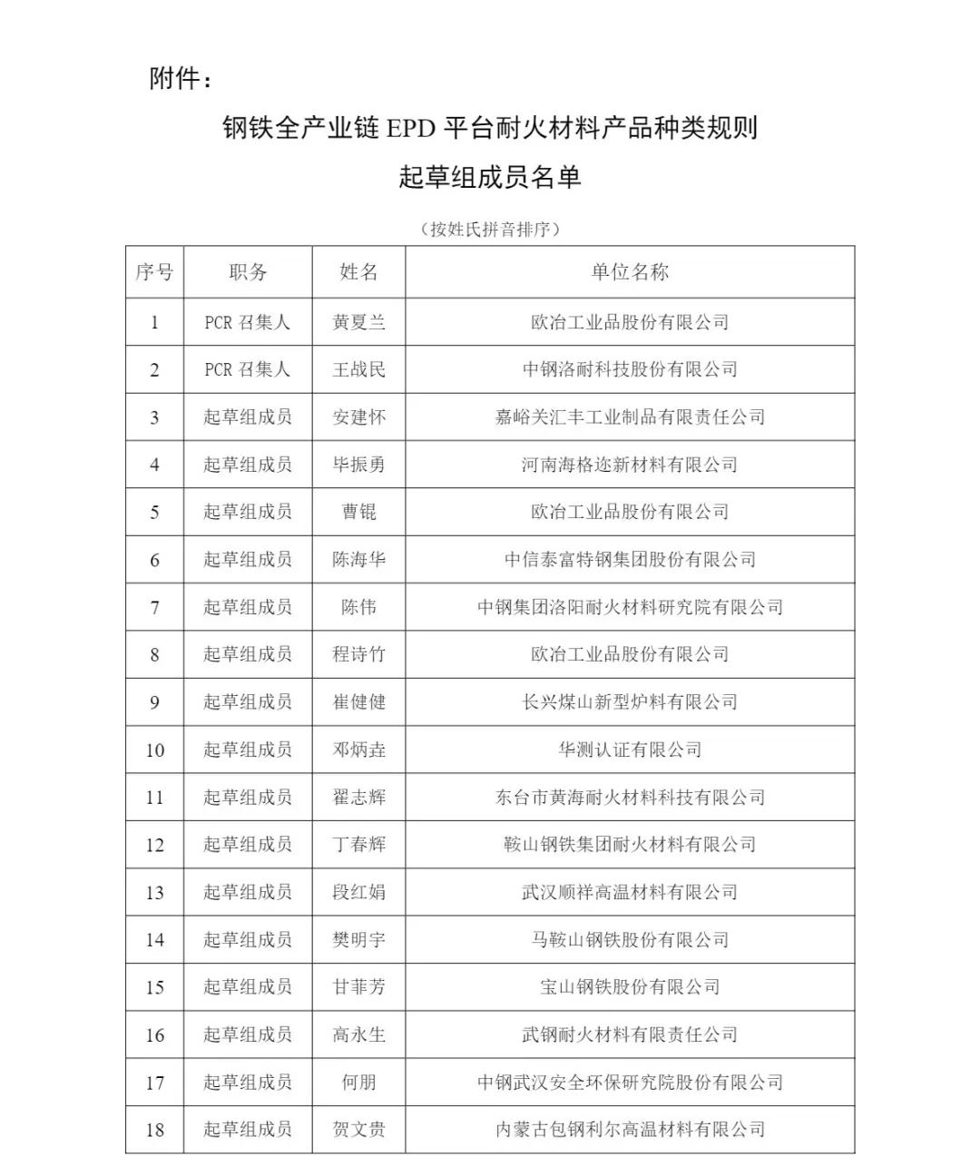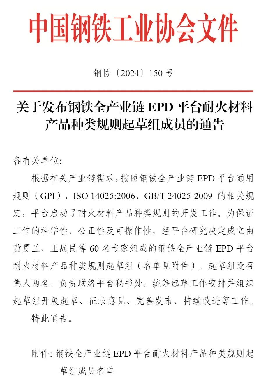 關(guān)于發(fā)布鋼鐵全產(chǎn)業(yè)鏈EPD平臺(tái)耐火材料產(chǎn)品種類規(guī)則起草組成員的通告?