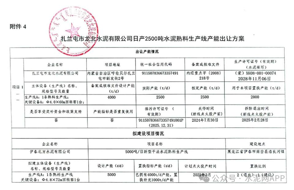10月31日,內(nèi)蒙古工信廳發(fā)布“關(guān)于對(duì)扎蘭屯市龍北水泥有限公司2500t/d水泥熟料生產(chǎn)線產(chǎn)能指標(biāo)出讓的公示”。