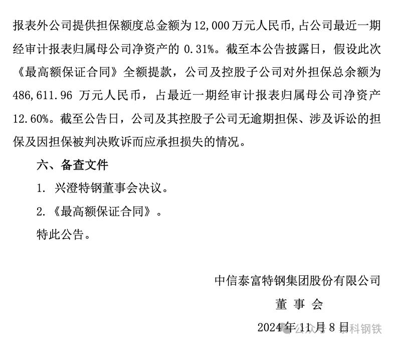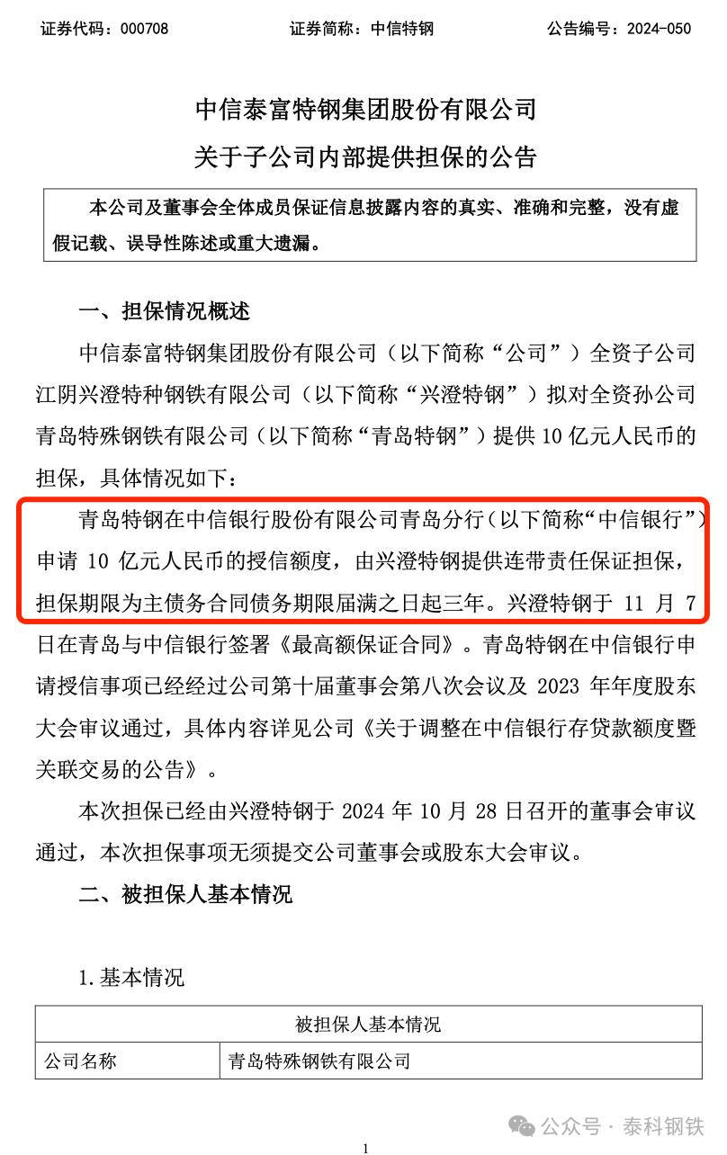 中信特鋼11月8日發(fā)布關(guān)于子公司內(nèi)部提供擔(dān)保的公告。公司全資子公司興澄特鋼擬對其全資孫公司青島特鋼提供10億元人民幣的擔(dān)保,以支持青島特鋼在中信銀行申請的授信額度。擔(dān)保期限為主債務(wù)合同債務(wù)期限屆滿之日起三年,相關(guān)合同已于11月7日簽署。