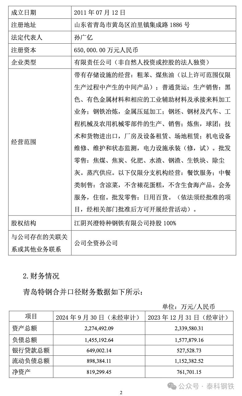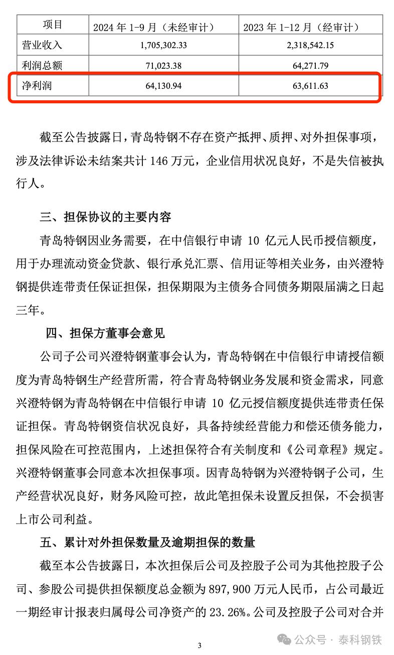 截至2024年9月30日,青島特鋼的資產(chǎn)總額為227.45億元,負債總額為145.52億元,凈資產(chǎn)為81.93億元,銀行貸款總額為64.9億元。青島特鋼的營業(yè)收入為170.53億元,凈利潤為6.41億元。公司及控股子公司為其他控股子公司、參股公司提供的擔(dān)保額度總金額為89.79億元,占最近一期經(jīng)審計報表歸屬母公司凈資產(chǎn)的23.26%。此次擔(dān)保未設(shè)置反擔(dān)保,董事會認為風(fēng)險可控,不會損害上市公司利益。