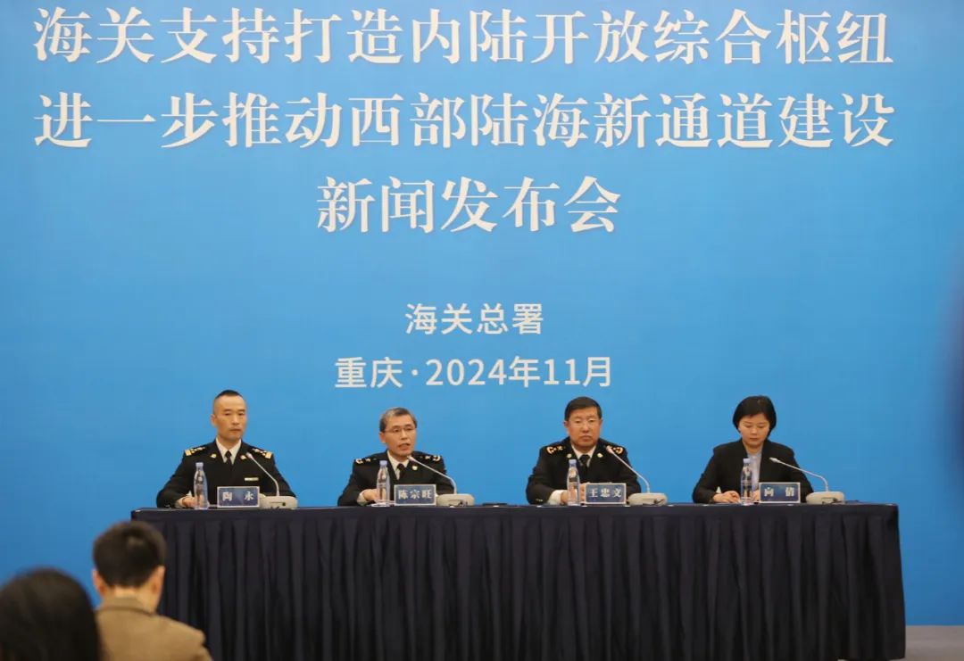 海關(guān)總署11月12日上午10時(shí)在重慶舉辦“海關(guān)支持打造內(nèi)陸開放綜合樞紐 進(jìn)一步推動西部陸海新通道建設(shè)”新聞發(fā)布會。海關(guān)總署綜合業(yè)務(wù)司副司長陳宗旺、重慶海關(guān)副關(guān)長王忠文、重慶市政府口岸物流辦副主任向倩出席介紹支持西部陸海新通道建設(shè)情況,并答記者問。