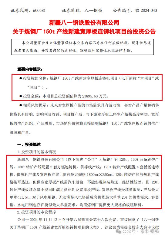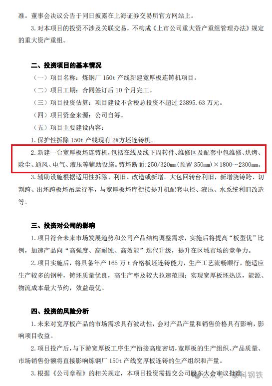 八一鋼鐵11月12日公告,公司擬投資不超過2.39億元建設煉鋼廠150t產(chǎn)線新建寬厚板連鑄機項目,合同簽訂后10個月完工。建設內(nèi)容包括保護性拆除150t產(chǎn)線現(xiàn)有2#方坯連鑄機;新建一臺寬厚板坯連鑄機,包括在線及線下周轉(zhuǎn)件、維修區(qū)及配套中包維修、烘烤、除塵、通風、電氣、液壓等輔助設施。