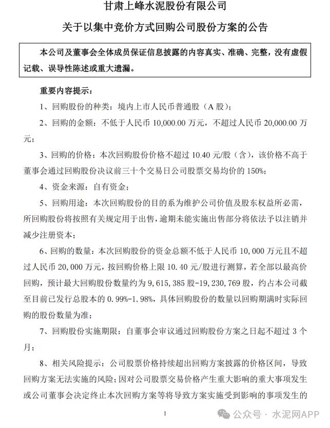 上峰水泥6月17日晚間發(fā)布公告稱,為維護(hù)公司價(jià)值及股東權(quán)益,立足公司長期可持續(xù)發(fā)展和價(jià)值增長,增強(qiáng)投資者對(duì)公司的投資信心,公司管理層在綜合考慮公司股票近期二級(jí)市場(chǎng)表現(xiàn),結(jié)合公司財(cái)務(wù)狀況、經(jīng)營情況以及未來盈利能力和發(fā)展前景,公司擬以自有資金進(jìn)行股份回購。