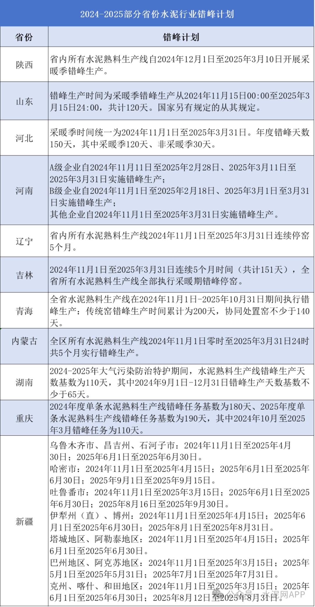 通知顯示,省內(nèi)所有水泥熟料生產(chǎn)線自2024年12月1日至2025年3月10日開展采暖季錯峰生產(chǎn);非采曖季支持省水泥協(xié)會牽頭,結(jié)合陜西省市場供需,環(huán)境保護(hù)等實際情況,與各熟料生產(chǎn)企業(yè)充分協(xié)商,適當(dāng)增加錯峰生產(chǎn)天數(shù),確保全年常態(tài)化錯峰生產(chǎn)順利進(jìn)行。通知要求,錯峰生產(chǎn)期間,因遇重污染天氣應(yīng)急、政府重大活動保障等需要,按地方政府要求執(zhí)行,停產(chǎn)時間計入錯峰停窯時間。同一廠區(qū)內(nèi),在不降低錯峰生產(chǎn)要求前提下,允許不同生產(chǎn)線間置換調(diào)整錯峰生產(chǎn)計劃;不同廣區(qū)的水泥熟料生產(chǎn)線,不得置換調(diào)整錯峰生產(chǎn)計劃。水泥熟料生產(chǎn)企業(yè)達(dá)到重污染天氣重點行業(yè)績評價A級的,所屬水泥熟料生產(chǎn)線可自主開展錯峰生產(chǎn)。