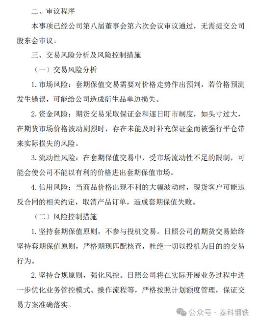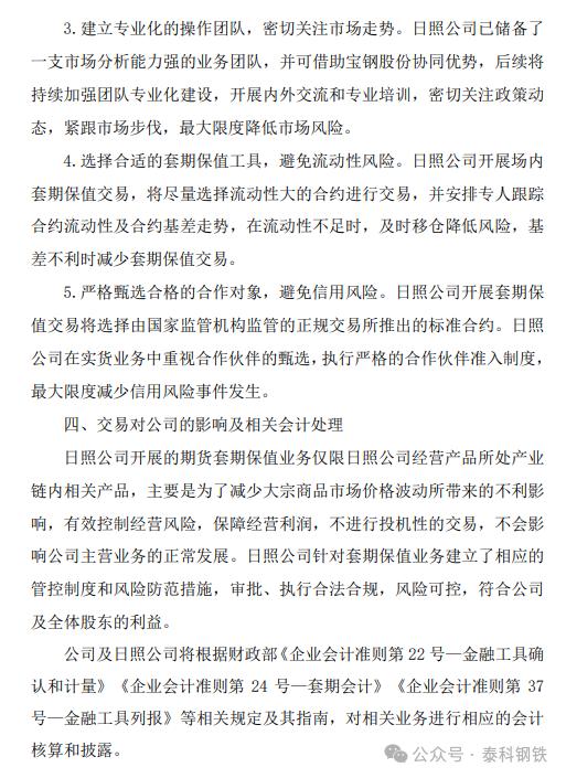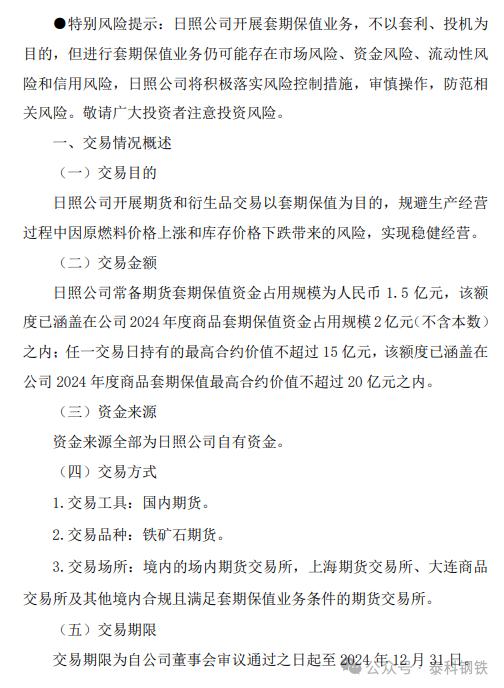 公告披露,山鋼日照常備期貨套期保值資金占用規(guī)模為1.5億元,該額度已涵蓋在該公司2024年度商品套期保值資金占用規(guī)模2億元(不含本數(shù))之內(nèi);任一交易日持有的最高合約價(jià)值不超過(guò)15億元,該額度已涵蓋在該公司2024年度商品套期保值最高合約價(jià)值不超過(guò)20億元之內(nèi)。該公司擬開展商品類金融衍生品業(yè)務(wù)的品種為鐵礦石期貨,期貨交易以套期保值為目的,規(guī)避生產(chǎn)經(jīng)營(yíng)過(guò)程中因原燃料價(jià)格上漲和庫(kù)存價(jià)格下跌帶來(lái)的風(fēng)險(xiǎn),實(shí)現(xiàn)穩(wěn)健經(jīng)營(yíng)。