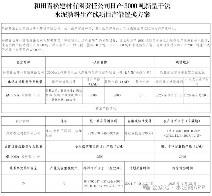 根據(jù)公示,和田青松建材有限責(zé)任公司計(jì)劃對(duì)日產(chǎn)2000噸新型干法水泥熟料生產(chǎn)線進(jìn)行技術(shù)改造,改造后的產(chǎn)能達(dá)到日產(chǎn)3000噸?,F(xiàn)申請(qǐng)按2:1的比例,置換60萬(wàn)噸(日產(chǎn)1000噸)水泥熟料產(chǎn)能,將申請(qǐng)將現(xiàn)有的日產(chǎn)2000噸生產(chǎn)線的產(chǎn)能補(bǔ)充至日產(chǎn)3000噸。