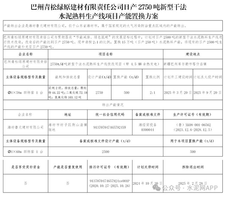 巴州青松綠原建材有限責(zé)任公司計(jì)劃對(duì)日產(chǎn)2500噸的新型干法水泥熟料生產(chǎn)線進(jìn)行技術(shù)改造,改造后的產(chǎn)能達(dá)到日產(chǎn)2750噸。現(xiàn)申請(qǐng)按2:1的比例,置換15萬(wàn)噸(日產(chǎn)250噸)水泥熟料產(chǎn)能,將現(xiàn)有的日產(chǎn)2500噸生產(chǎn)線的產(chǎn)能補(bǔ)充至日產(chǎn)2750噸。