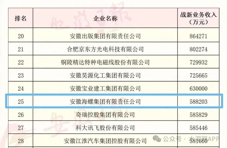海螺集團(tuán)名列“安徽百強(qiáng)企業(yè)戰(zhàn)略新興業(yè)務(wù)營(yíng)收30強(qiáng)榜單”第25位