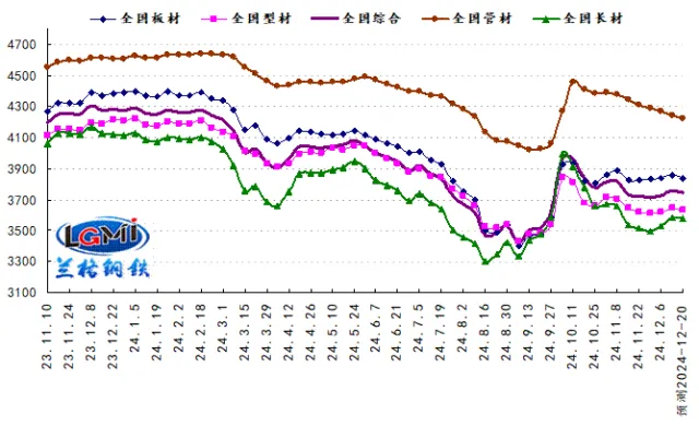 2024年第50周(2024.12.9-12.13)蘭格鋼鐵全國絕對價格指數(shù)為3760元,較上周上升0.9%,較去年同期下降12.3%;其中,蘭格鋼鐵長材絕對價格指數(shù)為3587元,較上周上升1.6%,較去年同期下降13.5%;蘭格鋼鐵型材絕對價格指數(shù)為3642元,較上周上升0.7%,較去年同期下降13.4%;蘭格鋼鐵板材絕對價格指數(shù)為3858元,較上周上升0.6%,較去年同期下降11.8%;蘭格鋼鐵管材絕對價格指數(shù)為4243元,較上周下降0.7%,較去年同期下降8.1%。