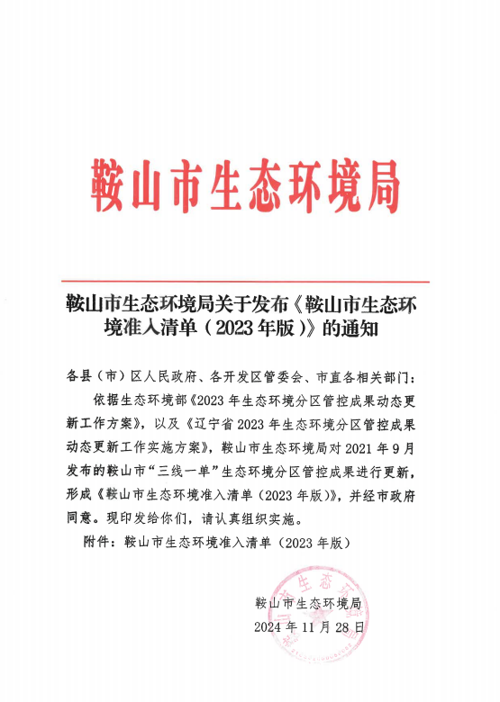 鞍山市生態(tài)環(huán)境局關(guān)于發(fā)布《鞍山市生態(tài)環(huán)境準(zhǔn)入清單(2023版)》的通知