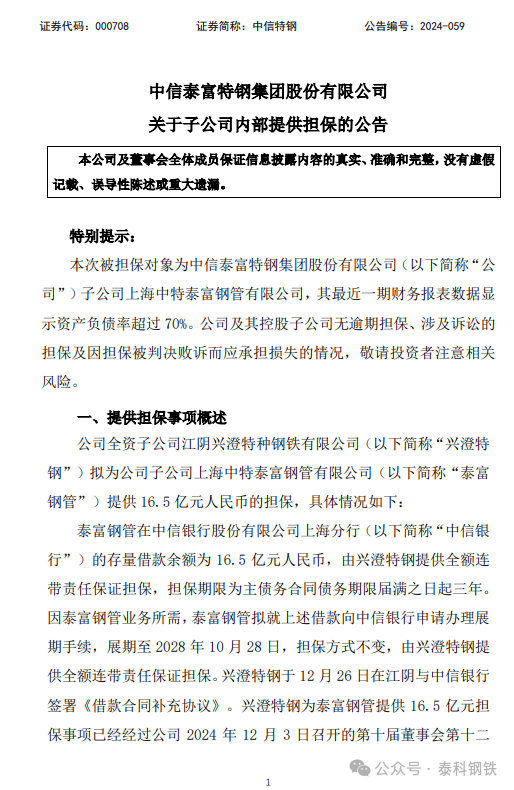中信特鋼12月27日發(fā)布公告,中信泰富特鋼集團(tuán)股份有限公司全資子公司江陰興澄特種鋼鐵有限公司擬為公司子公司上海中特泰富鋼管有限公司提供16.5億元人民幣的擔(dān)保。